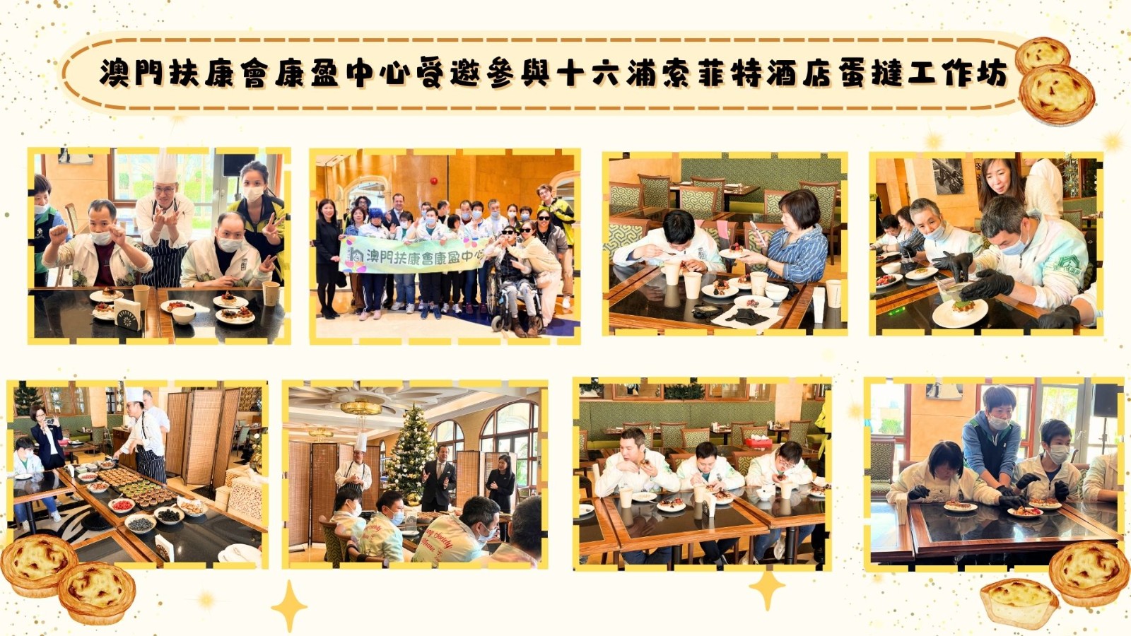澳門扶康會康盈中心服務使用者受澳門十六浦索菲特酒店邀請,於2025年11月25日下午15:00-16:30,中心服務使用者、家屬及員工共16人到場參加製作蛋撻工作坊。活動由澳門十六浦索菲特酒店兩位廚師教導參加者裝飾蛋撻,透過水果、迷你麵包、果醬,讓服務使用者與家屬體驗裝飾蛋撻的樂趣,發揮想像力,製作獨於自己獨一無二精美的水果蛋撻,製作完成後在場享用親手完成的蛋撻,同時澳門十六浦索菲特酒店亦為服務使用者送上聖誕節日祝福。
