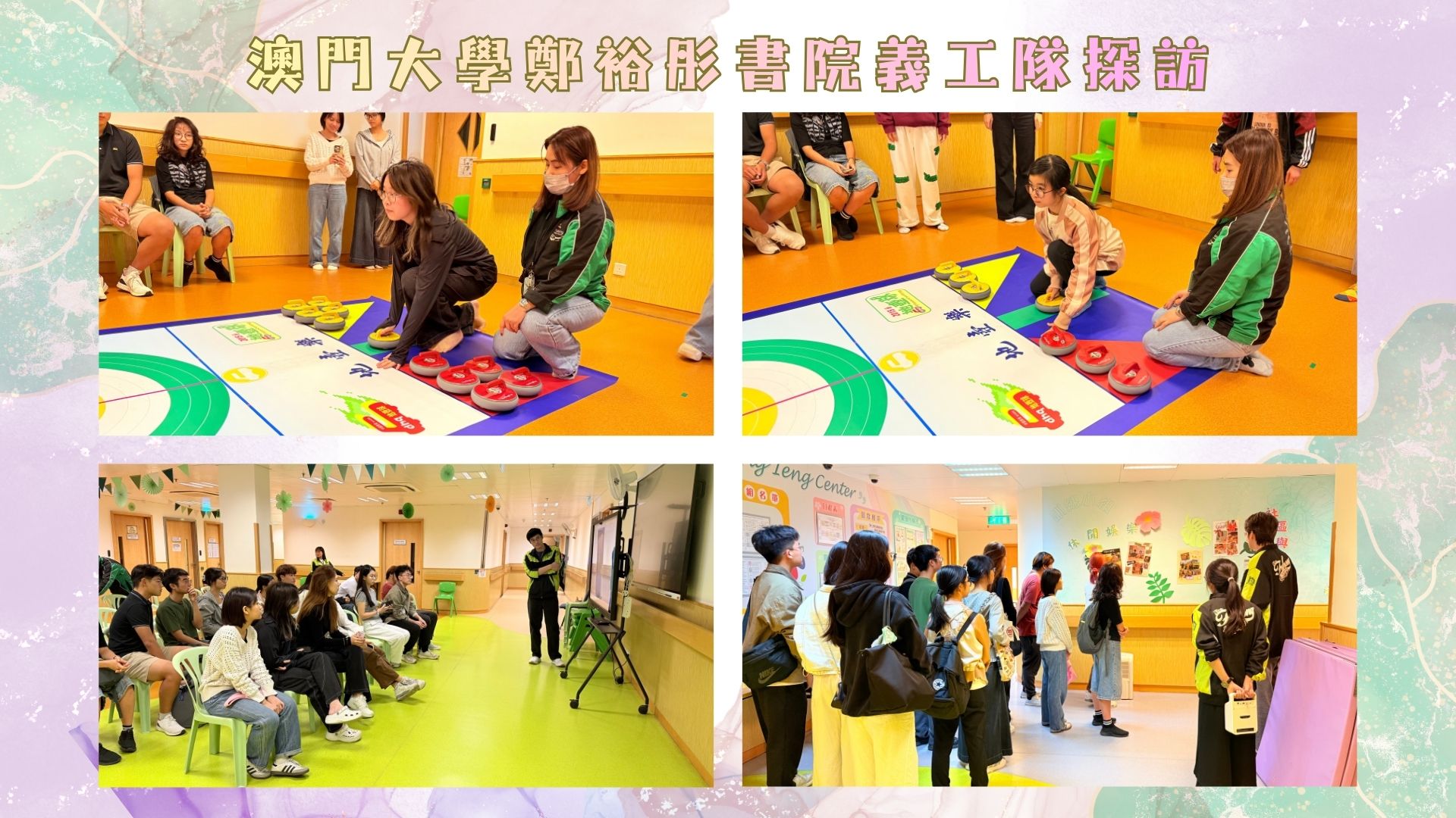 澳門大學鄭裕彤書院義工隊於2025年11月12日探訪澳門康盈中心,是次探訪旨在促進大學生了解機構日常,並透過「地壺球」體驗與服務使用者互動交流。