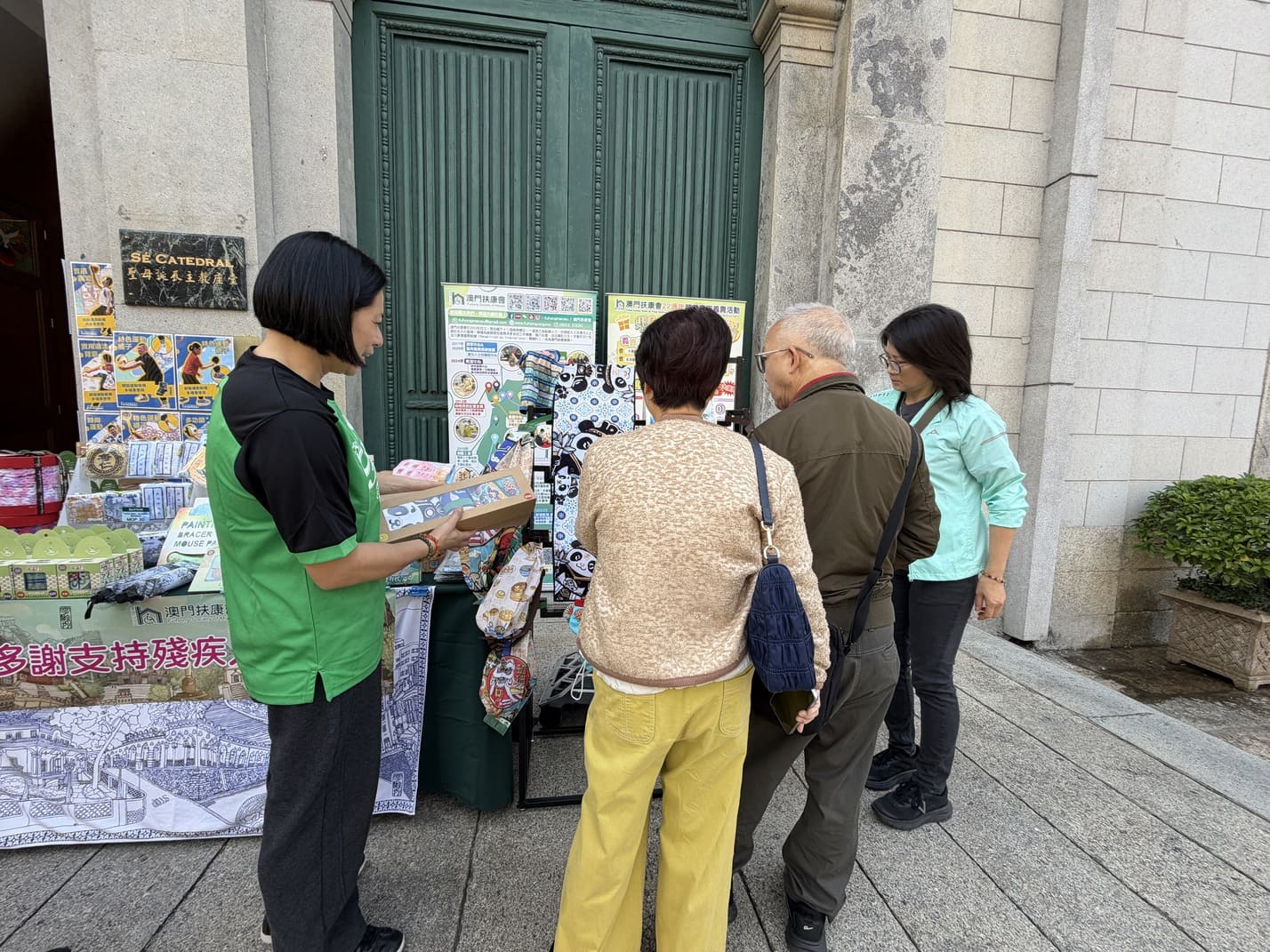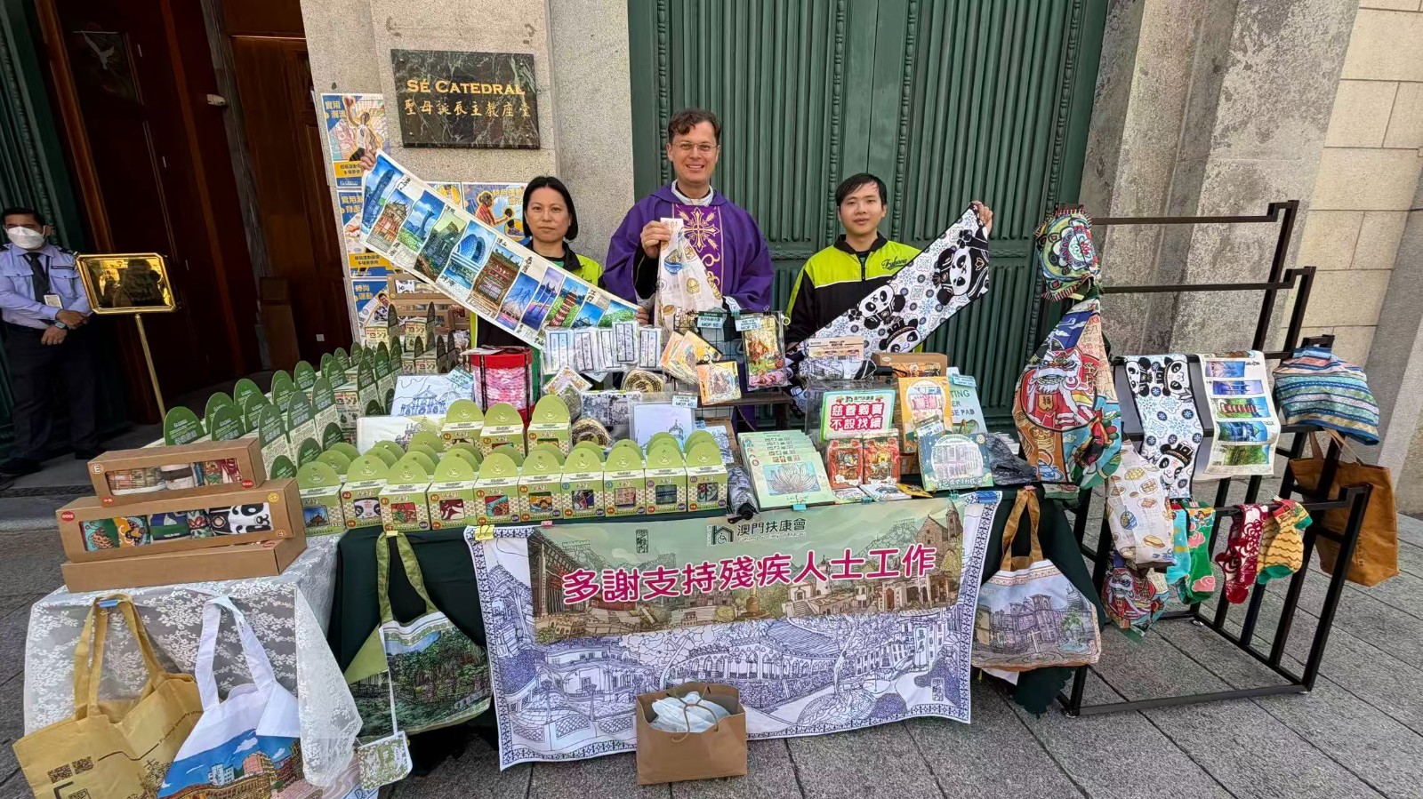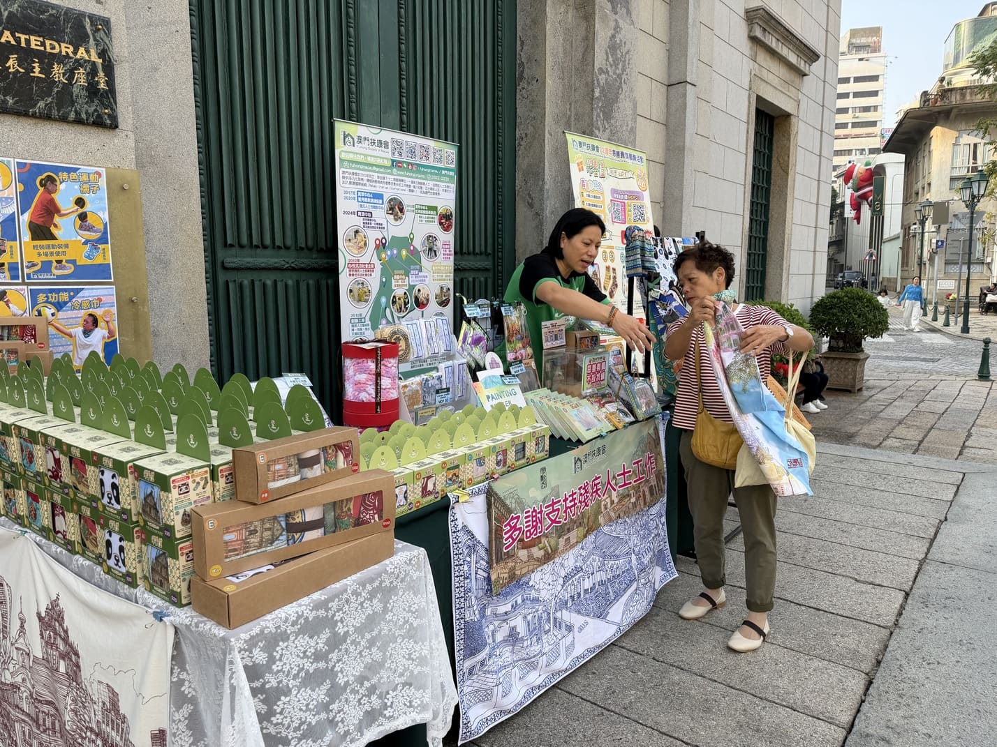 本會12月7日再次獲主教座堂支持,於教堂前地設置慈善義賣攤位。今年義賣以澳門扶康會二十二週年主題系列「樂善禮」為主打,同時展出多款由本會展能藝術家參與設計、並由殘疾人士協助製作及包裝的文創義賣產品。
