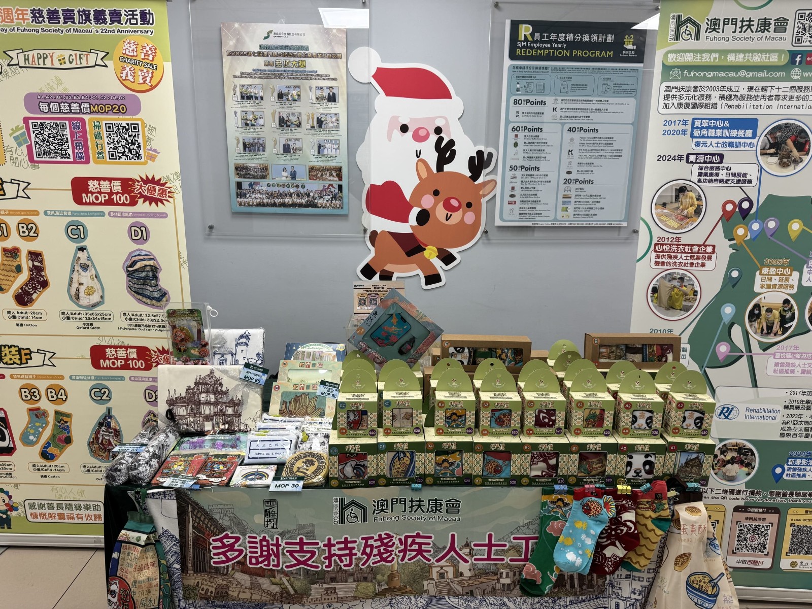 本會衷心感謝澳娛綜合的邀請,讓我們有機會於12月15日至17日在上葡京、海立方及新葡京的員工後勤區擺設慈善義賣攤位,為本會創造一個平台向更多員工及大眾推廣本會的慈善理念,讓了解殘疾人士的才華與潛能。慈善義賣所籌得的善款,將全數用於支援殘疾人士的培訓及發展項目。再次感謝澳娛綜合的支持及提供場地,讓公益活動得以順利進行,傳遞溫暖與正能量!