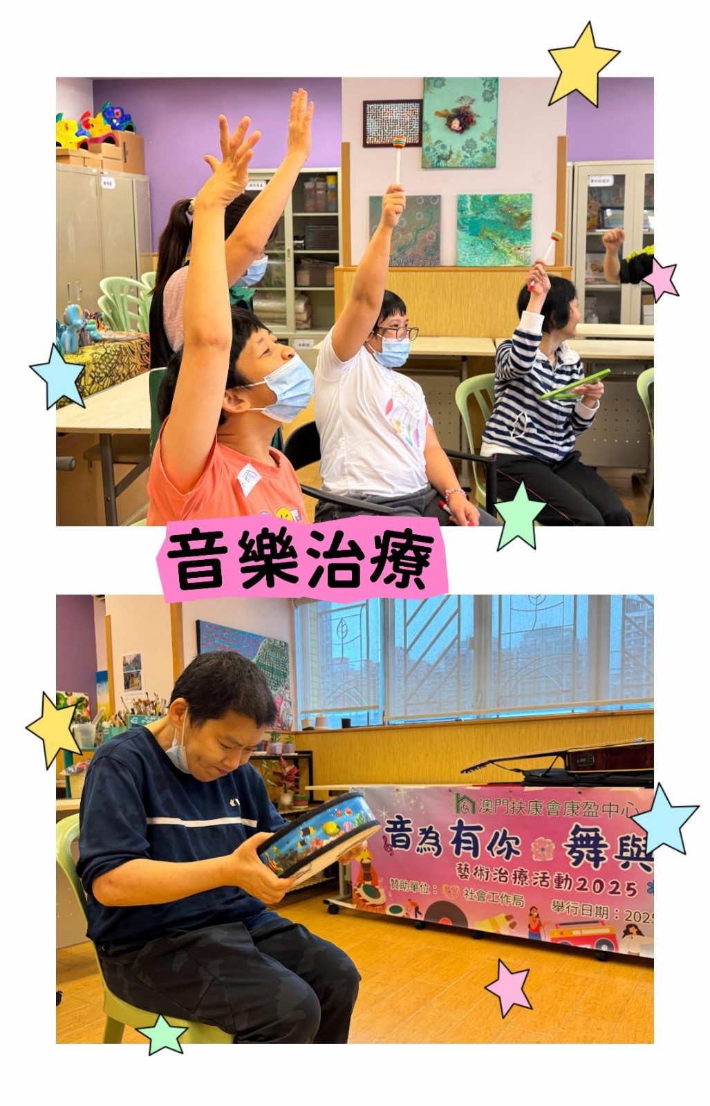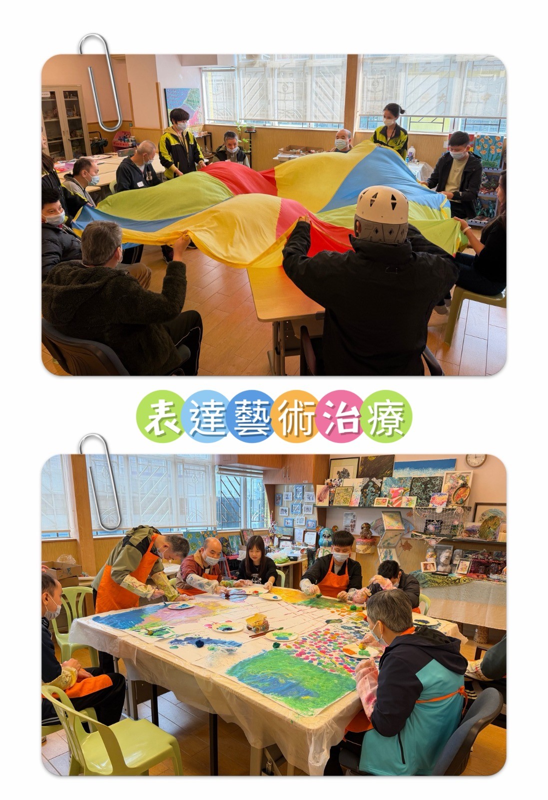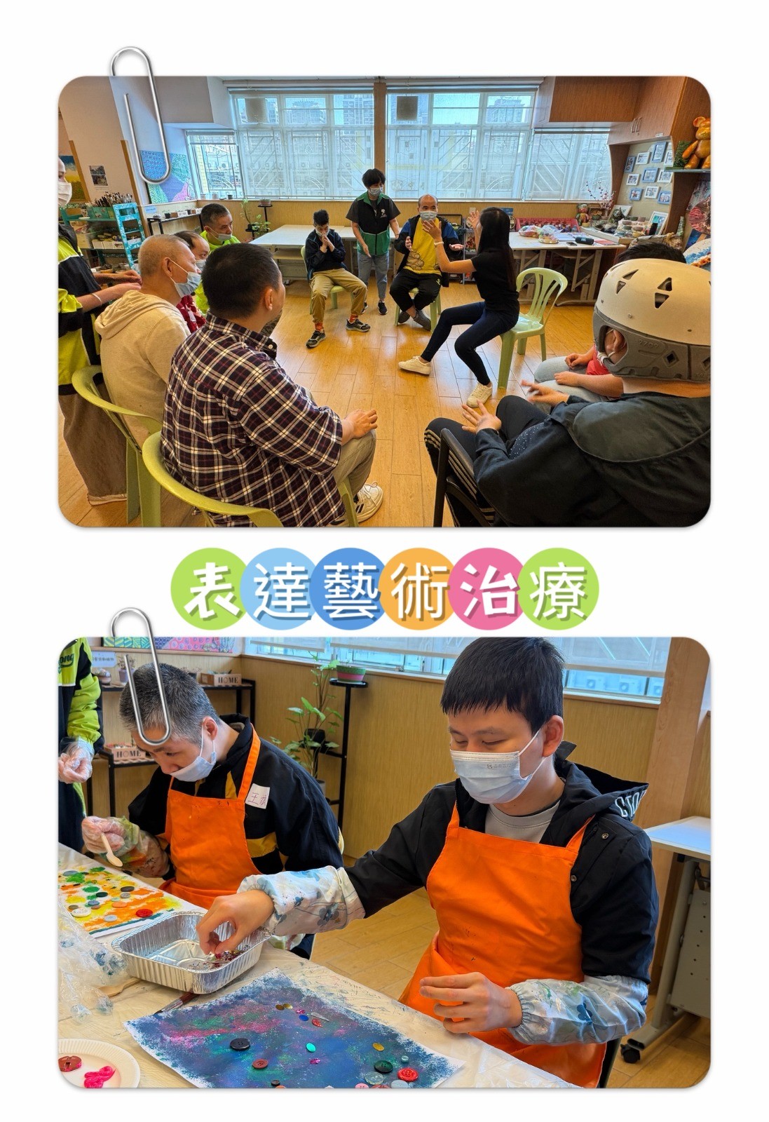 「表達藝術治療」則結合音樂、形體律動和藝術創作活動,鼓勵服務使用者自主抒發情緒、進行自我表達,並促進同儕間的互動交流,活動中運用多種材質的媒材進行藝術創作,不僅豐富了服務使用者的多感官體驗,亦有效促進手部精細動作能力。