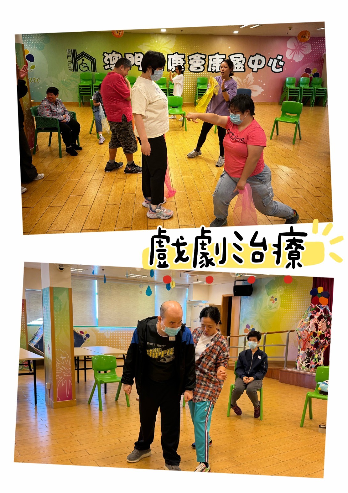 「戲劇治療」以10節的共生舞展開,治療師引導服務使用者進行非語言的身體表達與互動,設計了「絲巾拋接」、「你動我停」以及「配合空間」等活動,旨在讓服務使用者學習觀察與回應同儕的舞動動作,從而提升社交互動表現,整個過程不僅帶來愉悅與自在的體驗,也強化了服務使用者的自我效能感。