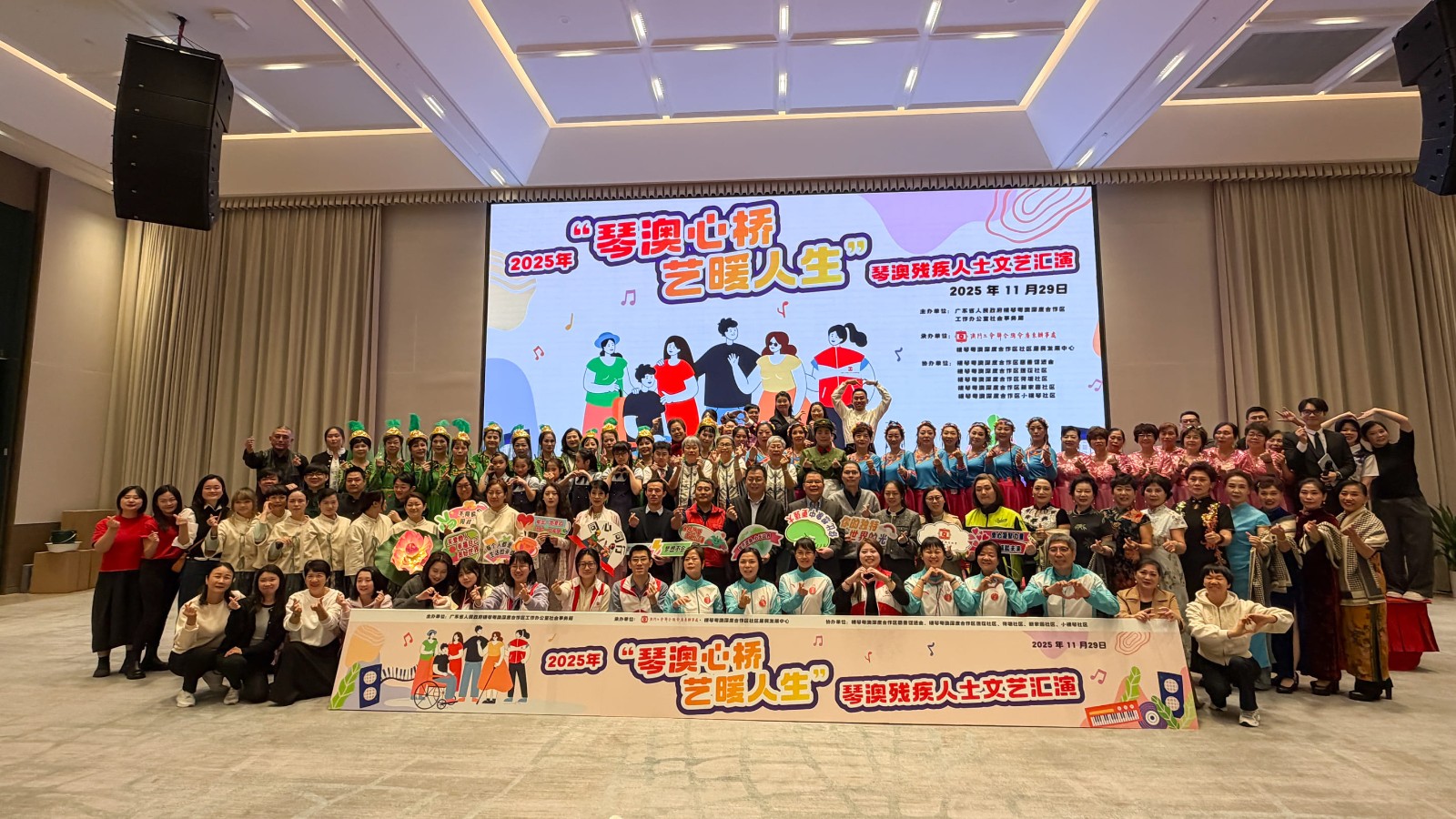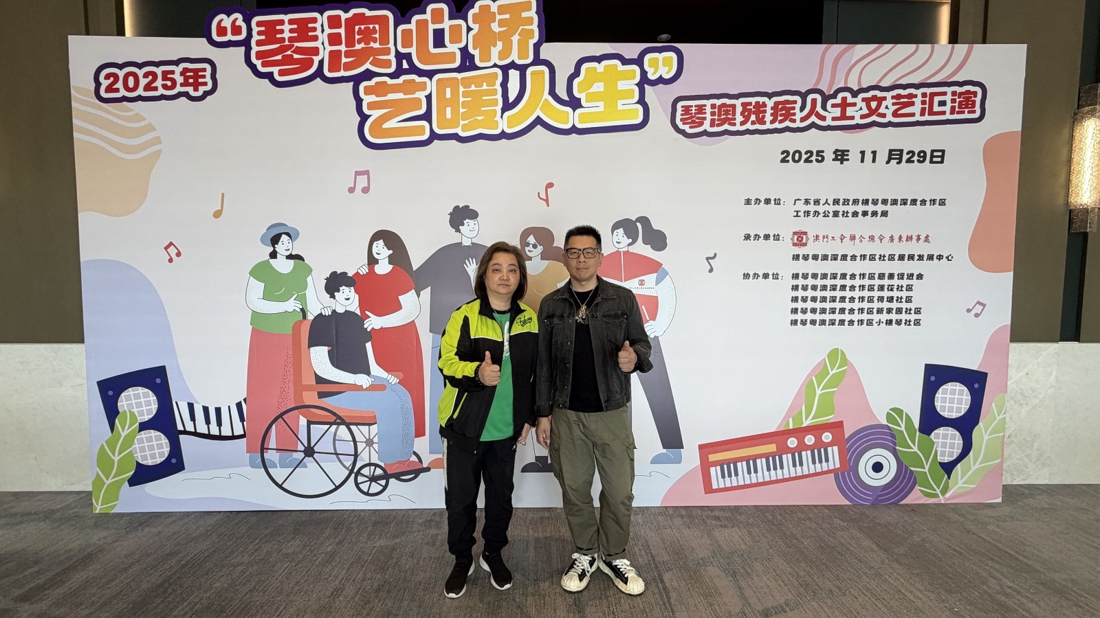 日前(11月29日),本會參與由橫琴粵澳深度合作區工作辦公室社會事務局主辦,澳門工會聯合總會廣東辦事處、合作區社區居民發展中心聯合承辦,蓮花社區協辦的【琴澳殘疾人士文藝匯演"琴澳心橋 藝暖人生"】。活動由本會行政經理卓敏儀女士應邀出席並代表接受紀念狀,同時,本會樂隊LIFE BAND主音劉康亦有幸受邀成為演出者之一,表演原創歌曲「幸福之約」。