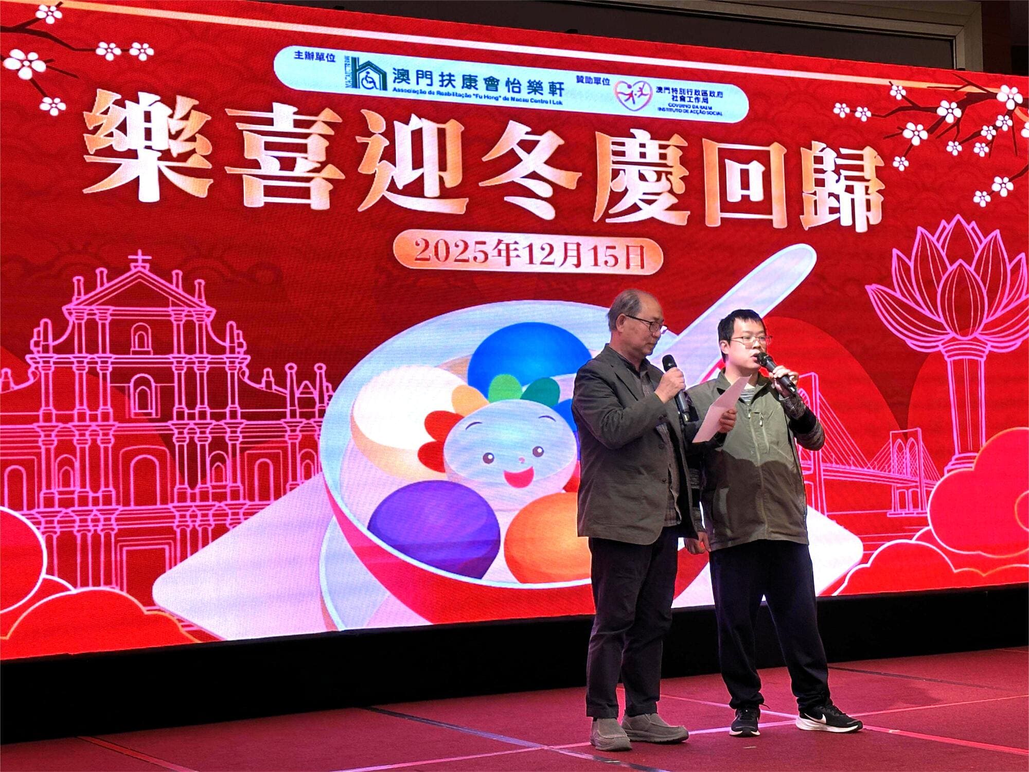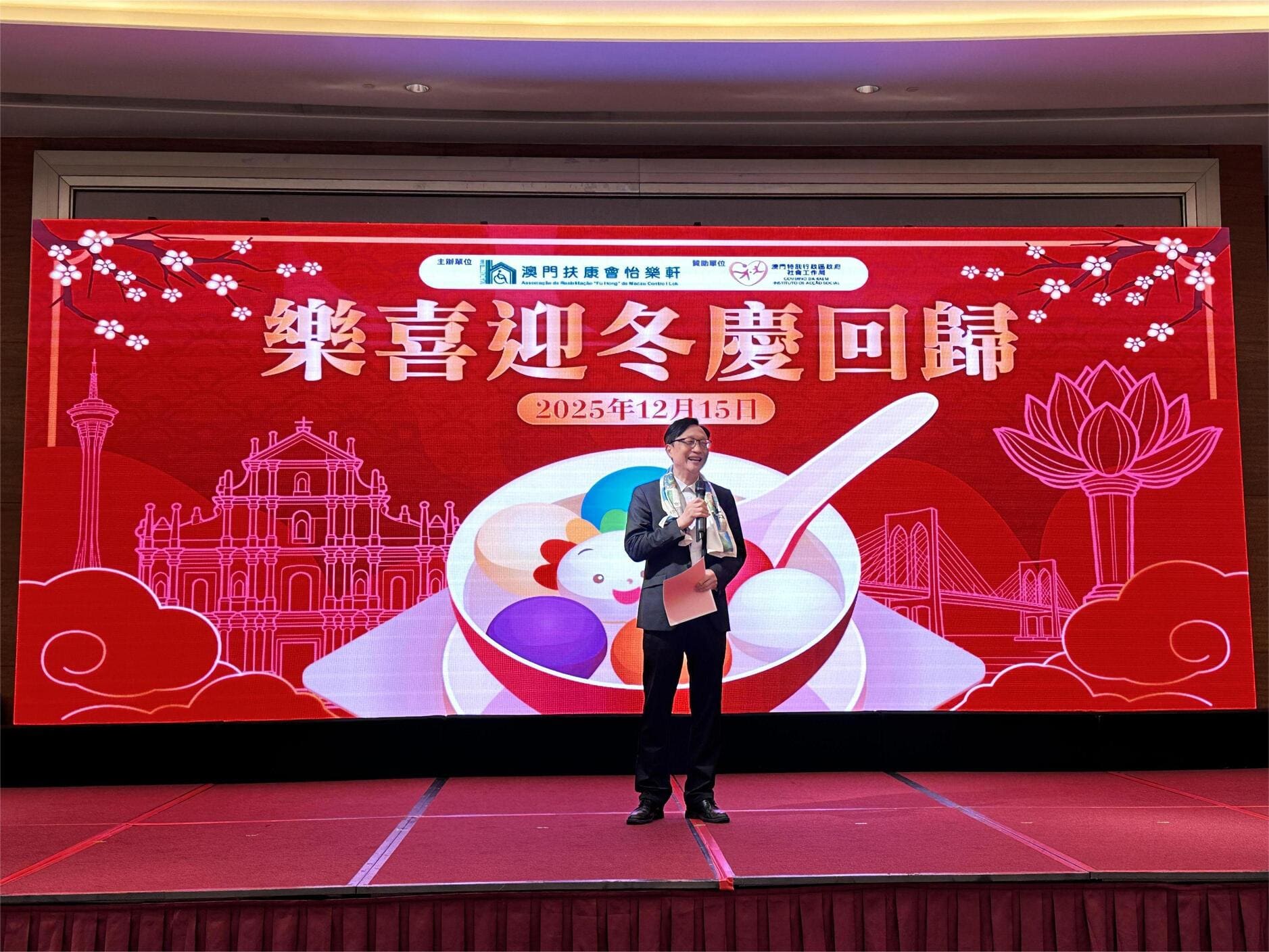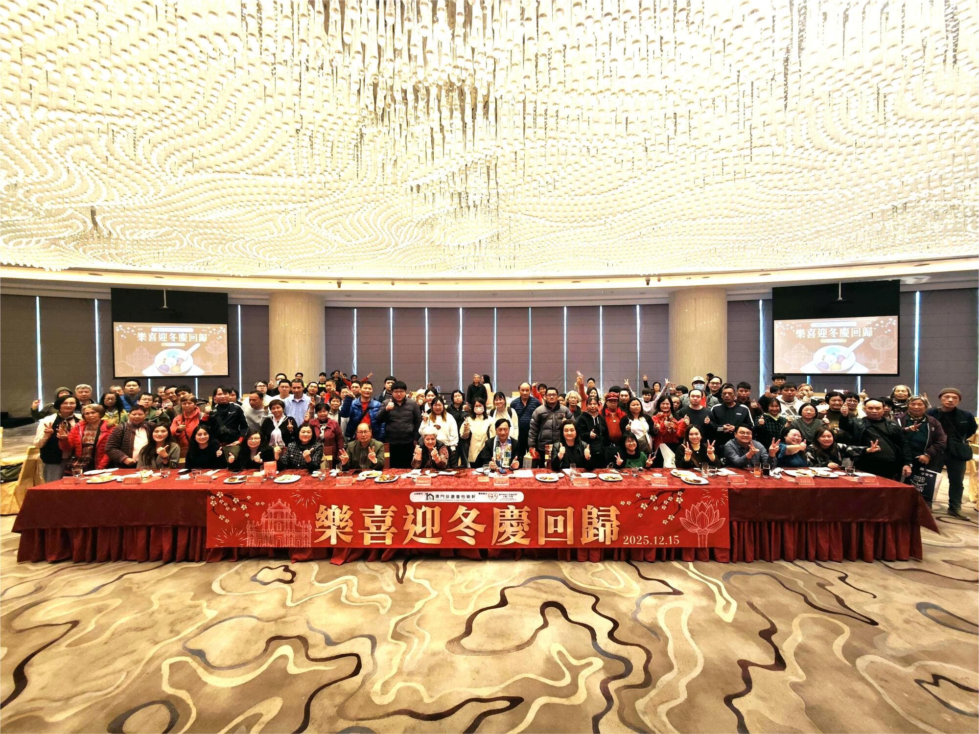 由社會工作局贊助、澳門扶康會怡樂軒主辦的「樂喜迎冬慶回歸」活動於12月15日圓滿舉行,吸引服務使用者及家屬共110人參與,理監事們及各中心經理蒞臨現場,共享冬至團圓與回歸喜悅。