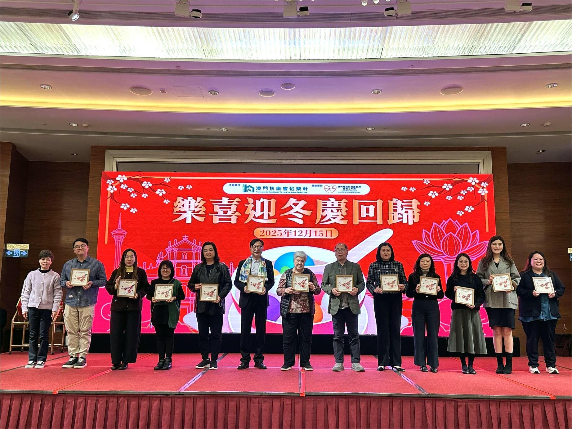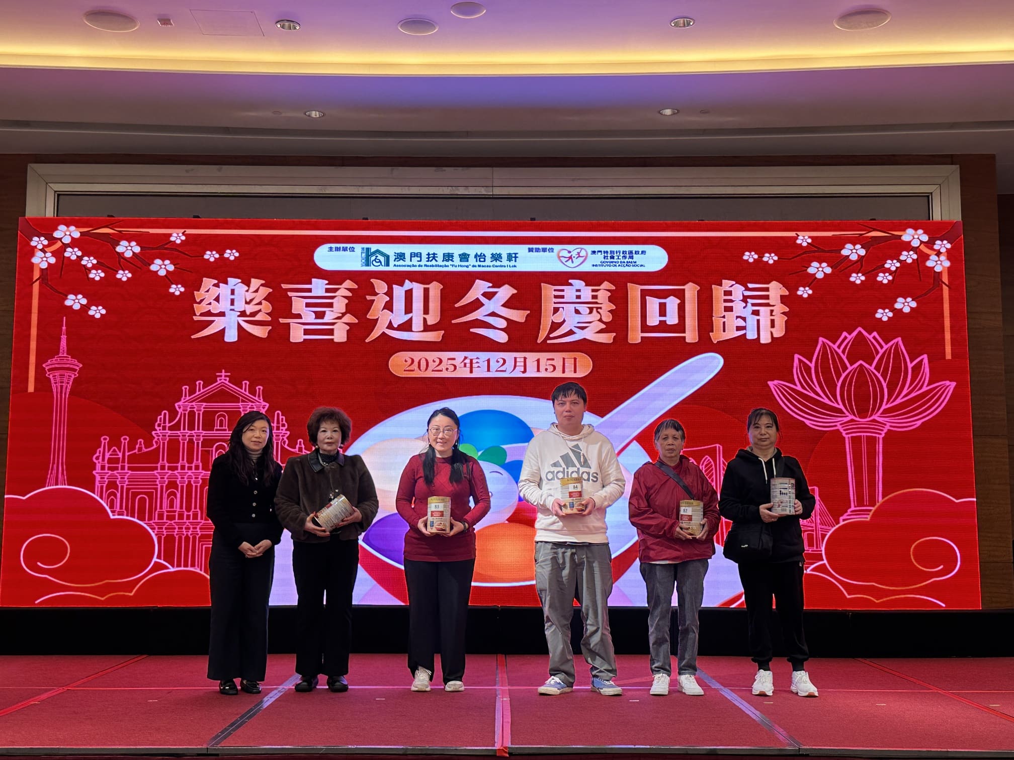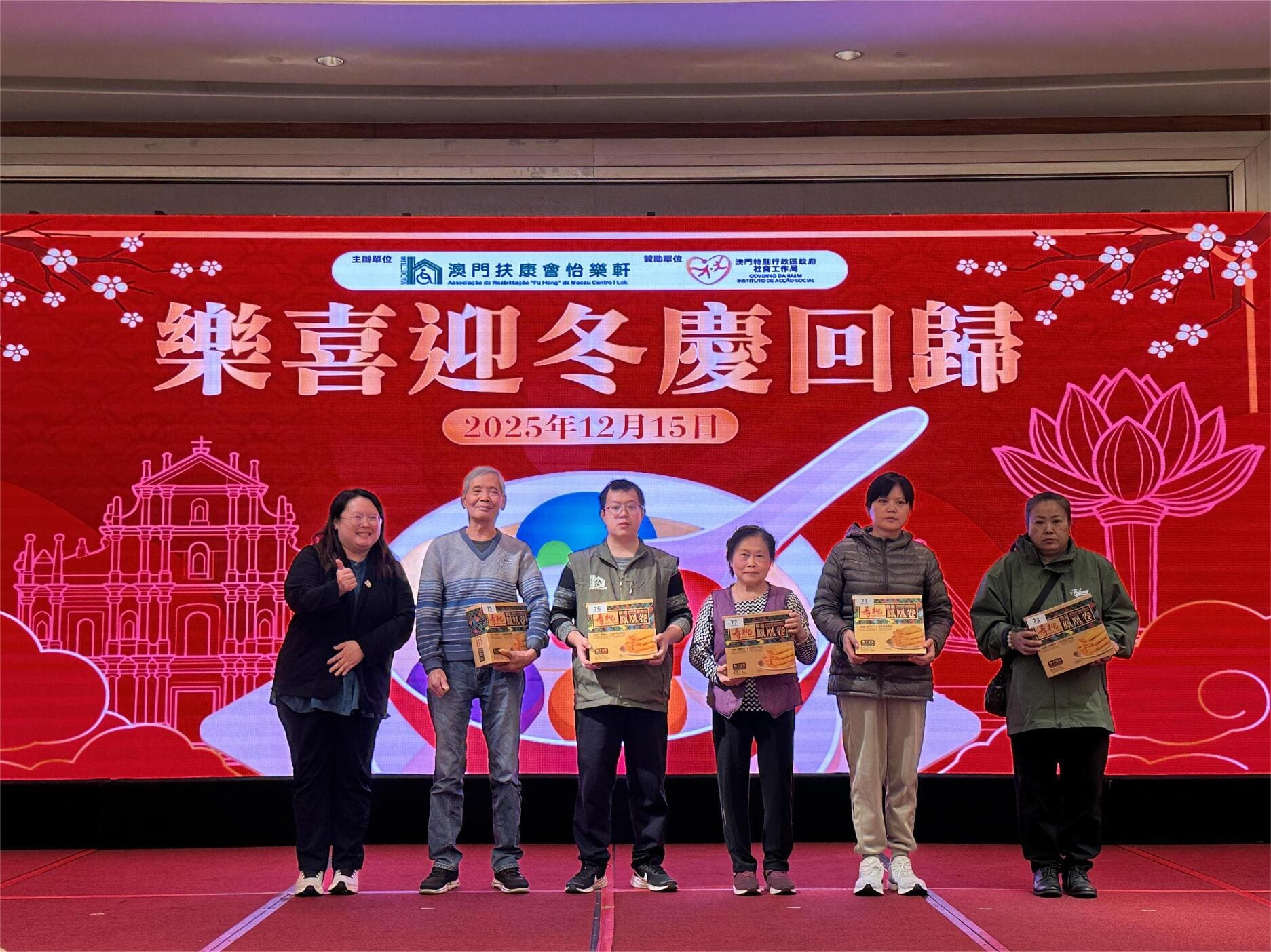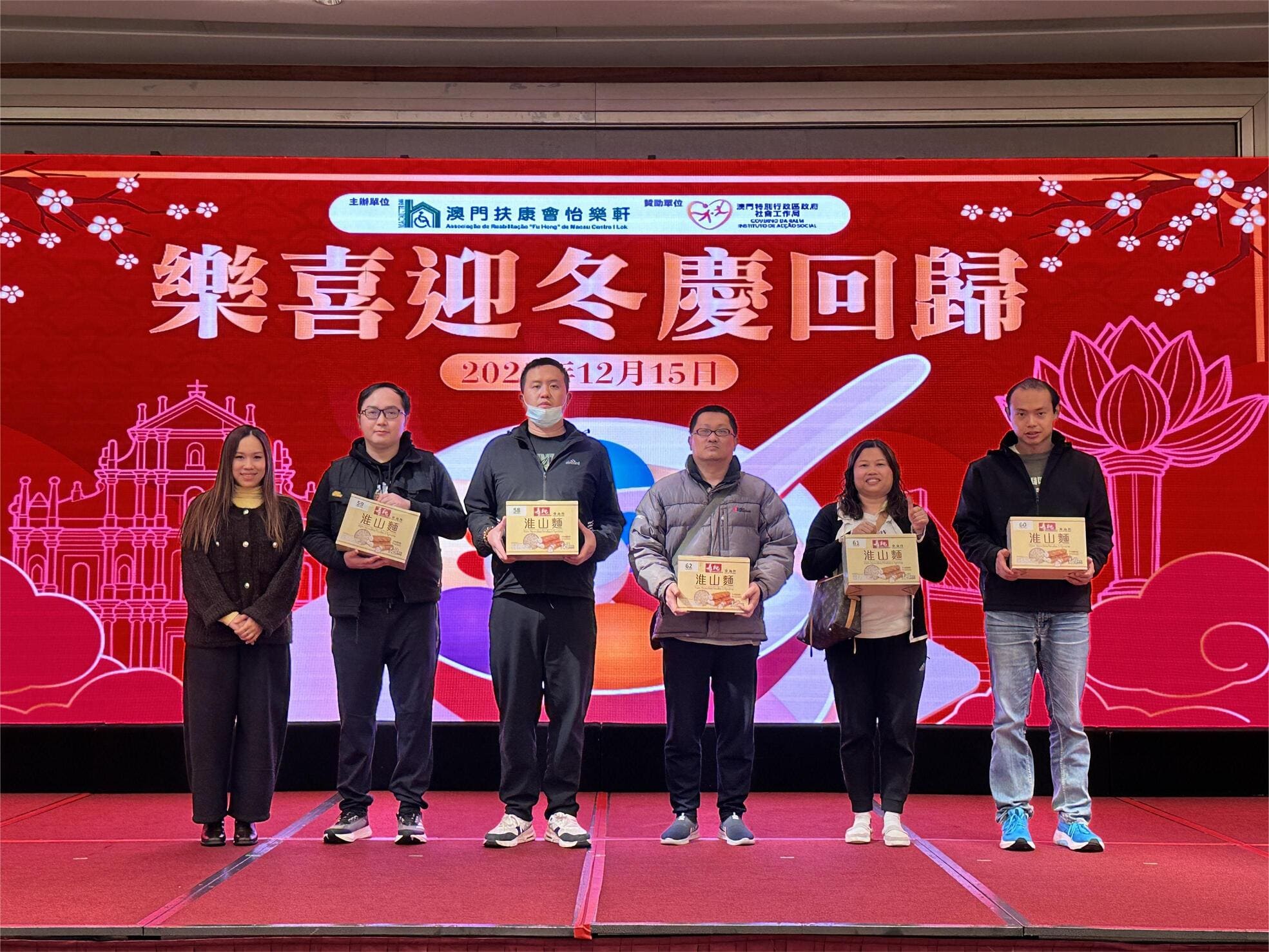 由社會工作局贊助、澳門扶康會怡樂軒主辦的「樂喜迎冬慶回歸」活動於12月15日圓滿舉行,吸引服務使用者及家屬共110人參與,理監事們及各中心經理蒞臨現場,共享冬至團圓與回歸喜悅。