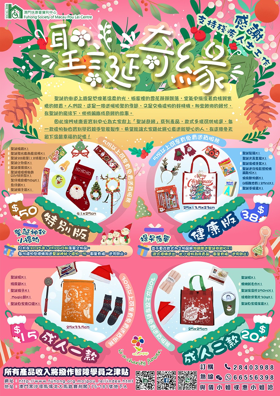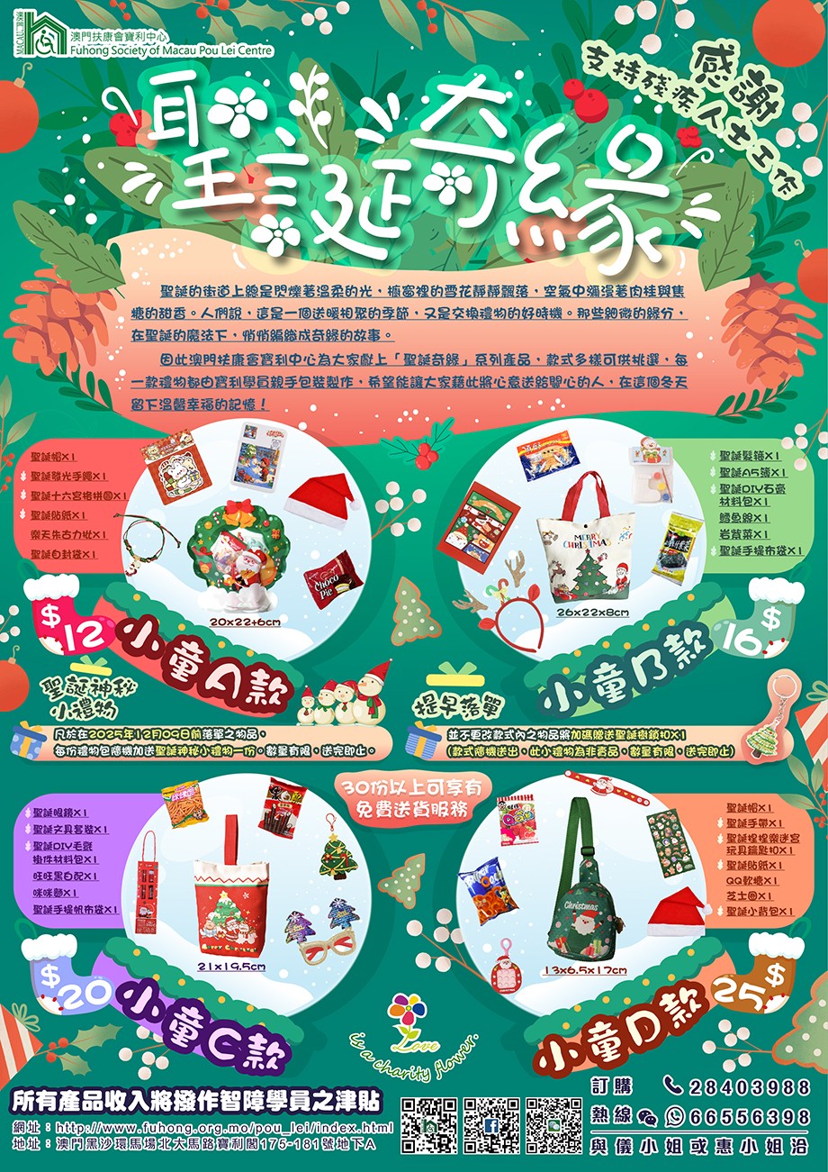 普天同慶的聖誕節即將來臨,快來準備一份可愛得意及具意義的聖誕節禮物給予朋友或家人。聖誕禮品數量有限,欲購從速,售完即止。所得的收益將撥作智障學員之津貼。請支持殘疾人士工作,希望得到大家踴躍訂購同時介紹給身邊的朋友,本中心非常感激!有關禮品的查詢或訂購,可致電2840 3988與儀小姐或惠小姐聯絡,亦可親臨位於黑沙環馬場北大馬路寶利閣175-181號地下A「澳門扶康會寶利中心」選購。有關產品更多資訊,請瀏覽本中心網頁: http://fuhong.org.mo/pou_lei/index/index.html