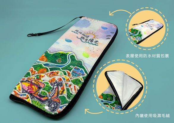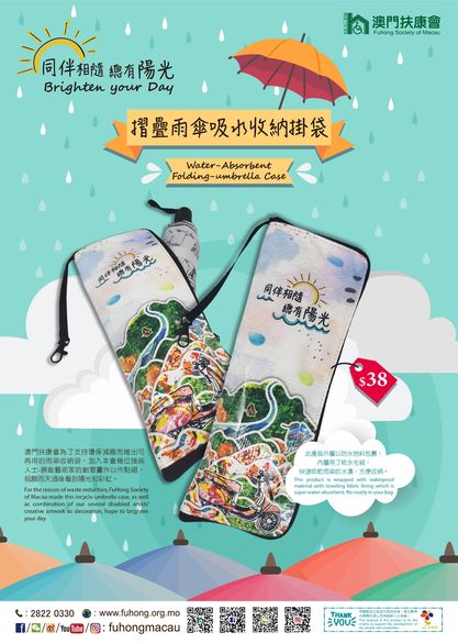 近年天氣雨水特别多,外出時難免遇上雨天,是不是常常為收納使用後的沾濕雨傘煩惱?澳門扶康會創藝工房特別為支持環保減廢,推出雨傘收納包,不但可以收納雨傘,而且可以吸收雨傘使用後的水份,輕鬆應對下雨天帶來的不便,除了雨天使用,收納包還可以在天氣炎熱時用作收納冰涼飲料,同樣有吸收水份的功用。收納包表層使用防水材質包裹,內襯則使用吸濕毛絨,可以在短時間內吸收水氣,內層吸水外層防水,保持整潔乾爽,且可以多次重覆使用,集環保實用美觀,晴時雨時皆合用。