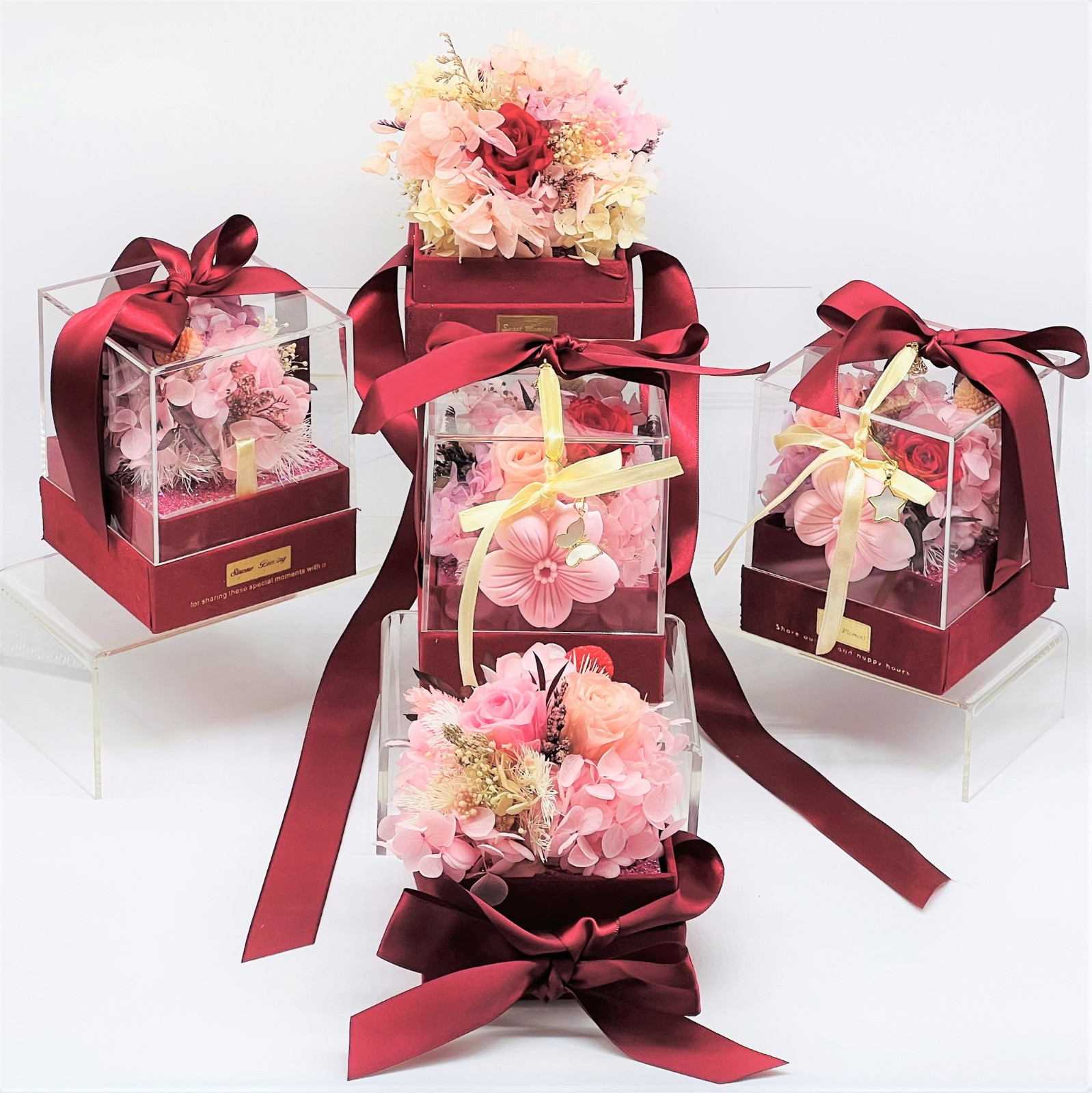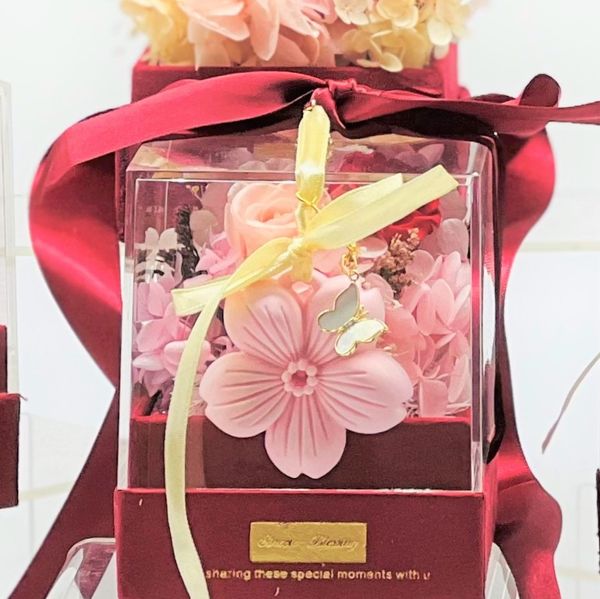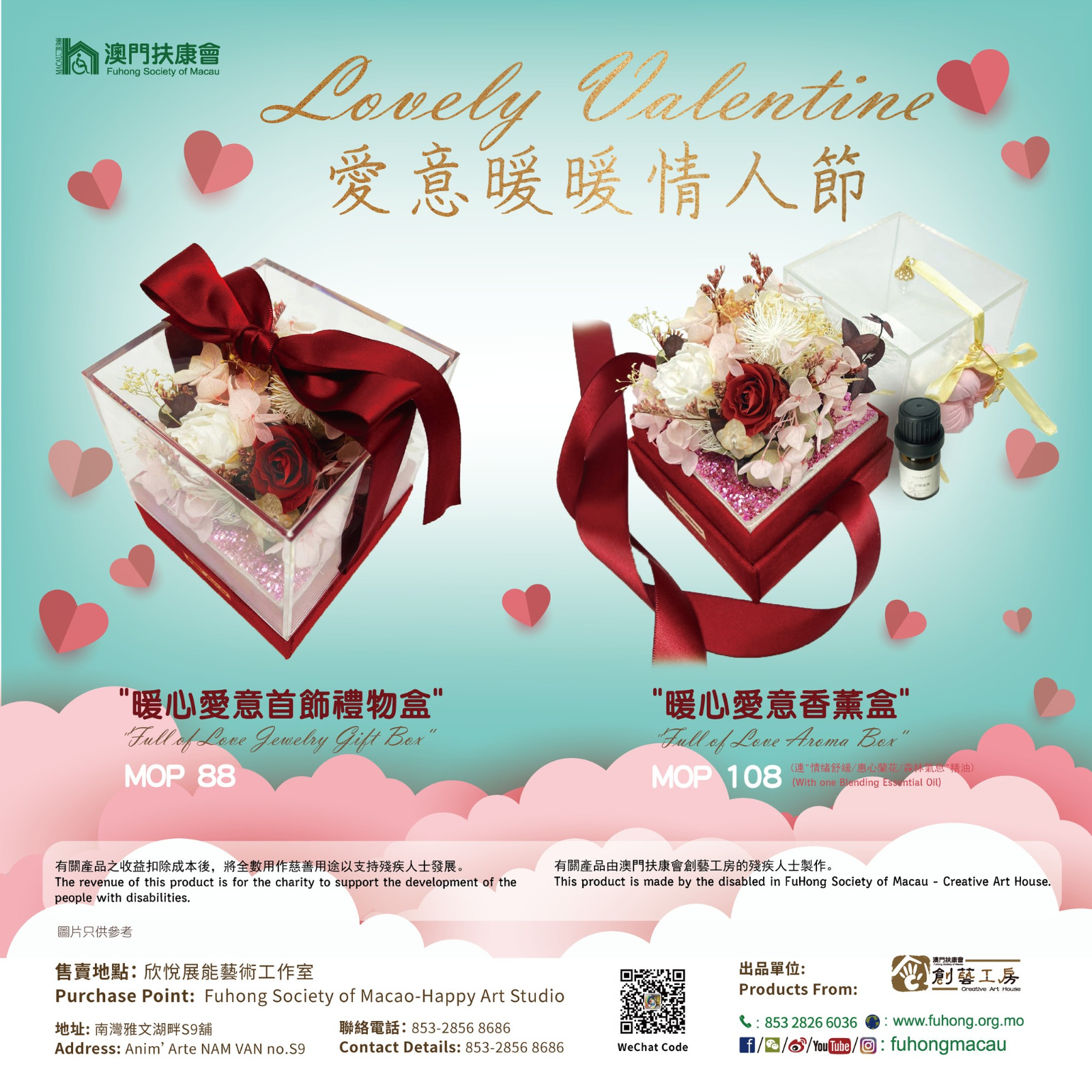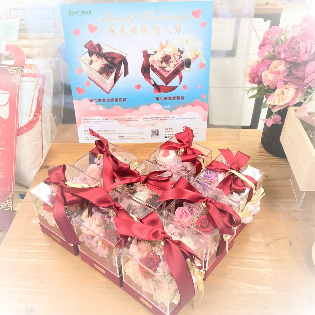 很多時,生活中有著難以透過言語表達內心的情感,情人節可讓自己憑著揀選的禮物為身邊的摯愛送上心意和祝福,最好的禮物從來都不是某樣東西,而是突如其來的驚喜和意料之中的溫暖,暖意從不過期,更重要的是被惦記著。在澳門扶康會創藝工房訓練的殘疾人士亦精心製作了一些情人節禮物,讓大家可為身邊摯愛準備一份禮物,以互助互助在社區內傳達愛意。 "暖心愛意首飾禮物盒/香薰盒",配拾了淡淡色彩的永生花,放入盒中永久保存,是承載愛意的最佳媒介。