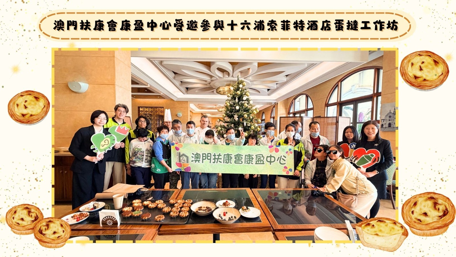 澳門扶康會康盈中心服務使用者受澳門十六浦索菲特酒店邀請,於2025年11月25日下午15:00-16:30,中心服務使用者、家屬及員工共16人到場參加製作蛋撻工作坊。活動由澳門十六浦索菲特酒店兩位廚師教導參加者裝飾蛋撻,透過水果、迷你麵包、果醬,讓服務使用者與家屬體驗裝飾蛋撻的樂趣,發揮想像力,製作獨於自己獨一無二精美的水果蛋撻,製作完成後在場享用親手完成的蛋撻,同時澳門十六浦索菲特酒店亦為服務使用者送上聖誕節日祝福。