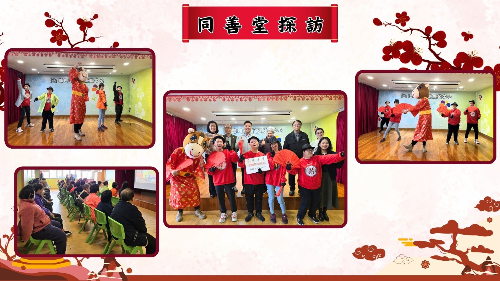 隨後,澳門扶康會會員大會主席飛迪華女士與中心服務使用者代表,一同向同善堂嘉賓致送由服務使用者親手製作、寓意吉祥的新春紀念品,以表達衷心謝意。康盈中心的服務使用者亦為嘉賓獻上精彩的新春舞蹈表演,現場氣氛熱鬧歡騰。