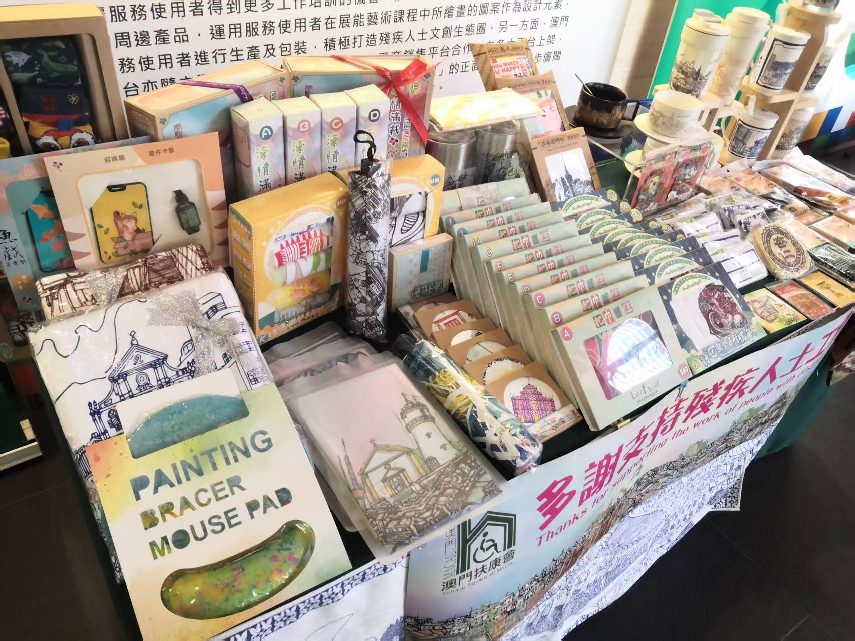 早前(4月10日),本會受澳門理工大學邀請參加了「齊關注SDGs聯合國可持續發展目標推廣日活動」,讓本會在活動現場擺設文創產品展示攤位,讓大家能夠了解到殘疾人士的潛能及工作能力,非常感謝澳門理工大學支持殘疾人士工作及其衍生文創產品,用實際行動去幫助有需要之人士。本會行政經理卓敏儀女士亦受邀出席開幕儀式,當天現場澳門理工大學學術事務部部長張詠藍女士亦給予感謝狀予本會並由本會行政經理卓敏儀女士代表接收,本會亦期望在今後與澳門理工大學有更多合作與交流,共同一起為推動公益事業及殘疾人士服務貢獻力量,攜手構建澳門共融和諧社區!