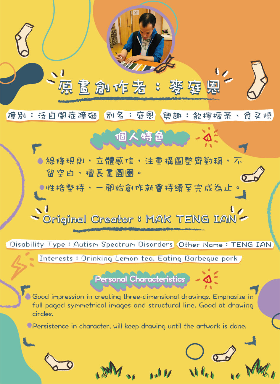 「一週襪語」已經開賣一個月了,相信不少人已經穿上了我們的襪子,小編非常感謝大家對殘疾人的支持!小編見到大家對襪子的評價和迴響都非常不錯,圖案精美,顏色鮮明,第一眼就吸引到大家的目光,而呢啲受歡迎嘅襪子背後,有著一班非常了不起的創作者,今日小編就帶大家看看,我們全城熱賣的「一週襪語」背後的創作者!他們是殘疾人士,但同時也是一位創作者,我們要放大的並不是他們的缺陷,而是他們閃閃發光的藝術才能,他們的繪畫風格有著各自不同的個人特色,擅長不同類型的藝術創作,「一週襪語」襪子每一對都包含了屬於他們的個人特色,作為本會的展能藝術家,他們的作品常常被製作成各式文創產品,都深受大家歡迎,今次的「一週襪語」也不例外,仲未訂購的朋友記得快啲黎支持他們!有興趣的朋友可以透過線上訂購表https://forms.gle/Z26KqkSaaUd8WgVx8 訂購或致電28220330!