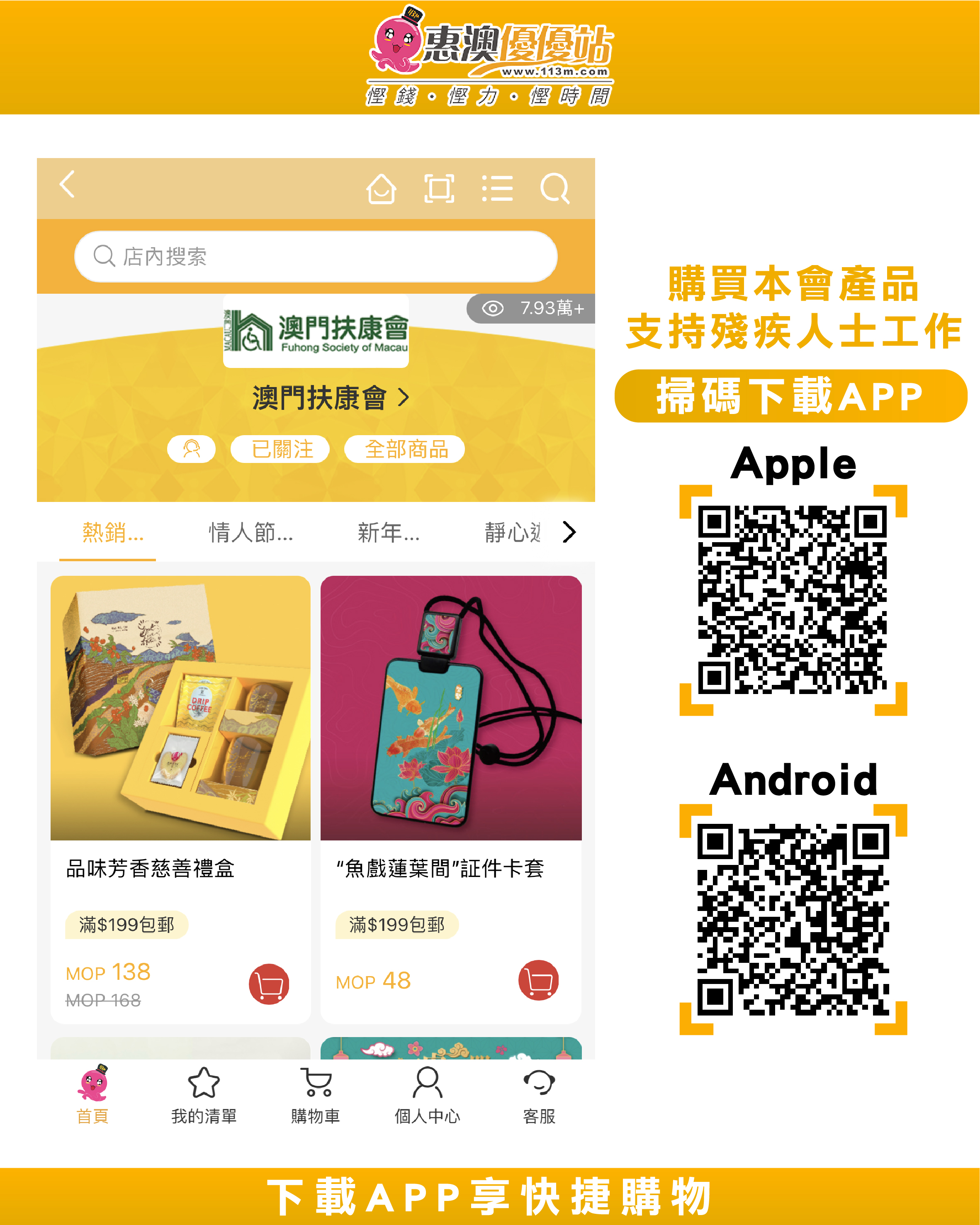 隨著線上購物的普及化,本會也積極發展線上購物平台,務求讓大家安坐家中就可以支持殘疾人士衍生文創產品,現時本會在南光通、惠澳優優站、紅點平台皆有上架產品,大家掃描下方二維碼下載app,搜尋“澳門扶康會”,動一動手指,心儀的產品就可送到家門口,歡迎大家支持本會的電商購物平台,快點下載app選購產品啦!