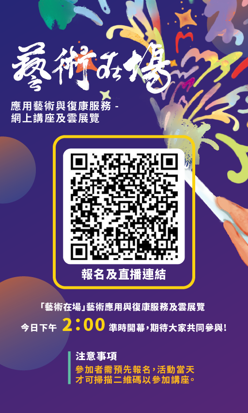 「藝術在場」講座已經開始啦,有不少的人已經在線觀看中,有興趣之人士可以掃描海報QR code即可進入講座或雲展覽觀看!請多多支持我們!對象是社區人士、家長、教師、 需要照顧有特殊需要人士的工作人員以及對藝術治療或藝術應用有有興趣之人士。