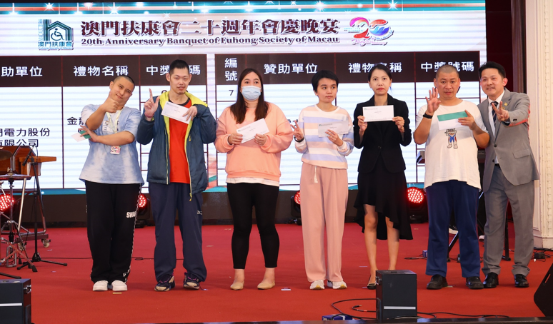 會慶晚宴中亦向各中心服務使用者頒發「飛躍進步大獎」以示鼓勵。本會也十分感謝各愛心關懷商企及善長捐出抽獎禮物,讓學員及家長們歡度了一個愉快的晚上。此外,服務使用者亦為眾人展示了本會二十週年由「零點叄捌」慈善品牌推出的義賣物——「濠情滿載愛意常在」多功能收納組合,配合音樂和舞蹈,現場氣氛溫馨歡樂。而服務使用者的家屬、本會「Life Band」和職員亦為晚宴獻唱助慶,「Life Band」更帶來四首歌曲,當中更包括一首全新歌曲,炒熱了現場氣氛,將晚宴帶到高潮,讓各嘉賓均盡興而返。