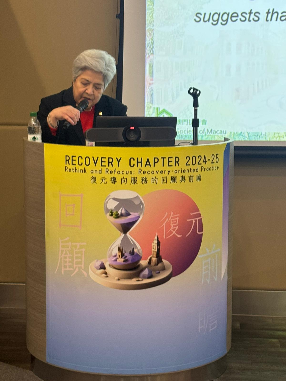 早前(1月15日),本會會員大會主席飛迪華女士、總幹事周惠儀女士等一行人參與「復元講座系列2024-25:復元導向服務的回顧與前瞻」,本會會員大會主席飛迪華女士獲邀作為講者之一,以「復元導向在澳門實踐」(Recovery-oriented practice in Macau)作主題分享,與一眾參與者互動及交流;葵涌醫院高級職業治療師暨香港理工大學客座助理教授朱漢威先生,亦是澳門扶康會精神復康服務顧問委員會委員,他分別以「醫院內復元概念之實踐」(Hospital-based Recovery-oriented Practice)及「以正向心理治療提升在香港思覺失調患者的幸福感」(Positive Psychotherapy for People with Psychosis in Hong Kong to enhance well-being)作主題分享。其後,本會會員大會會長飛迪華女士等一行人與葵涌醫院代表醫院行政總監阮家興醫生、職業治療部部門經理潘恩賜女士等人互贈紀念品以表謝意,並與嘉賓香港大學謝樹基教授等人合照留念。
