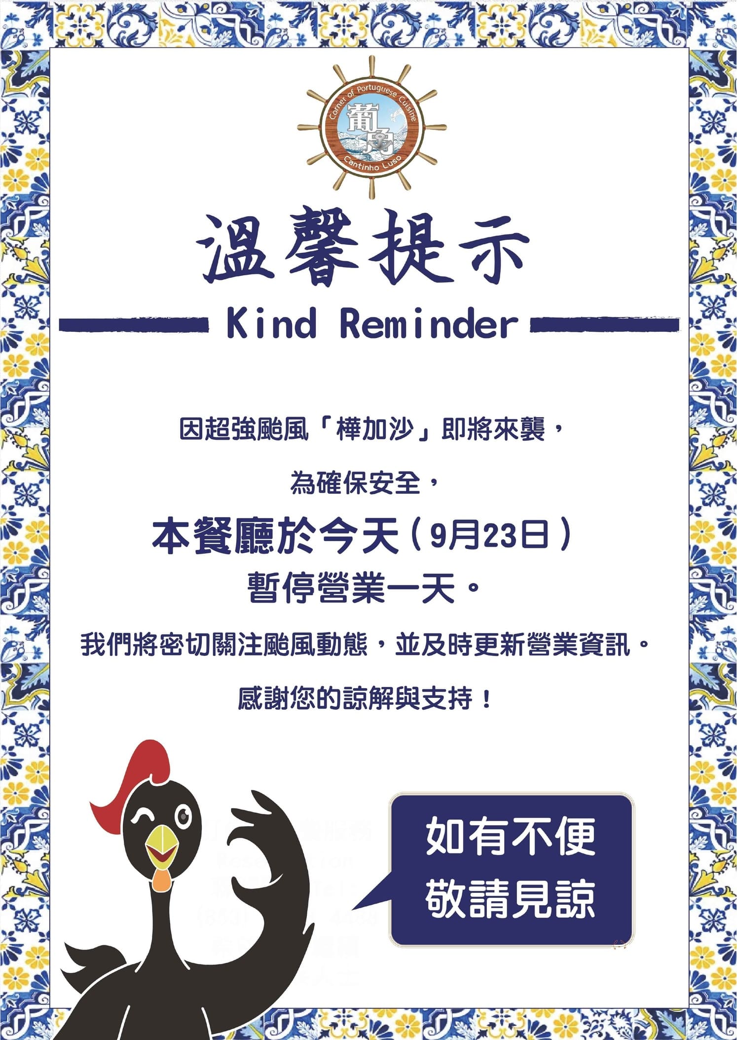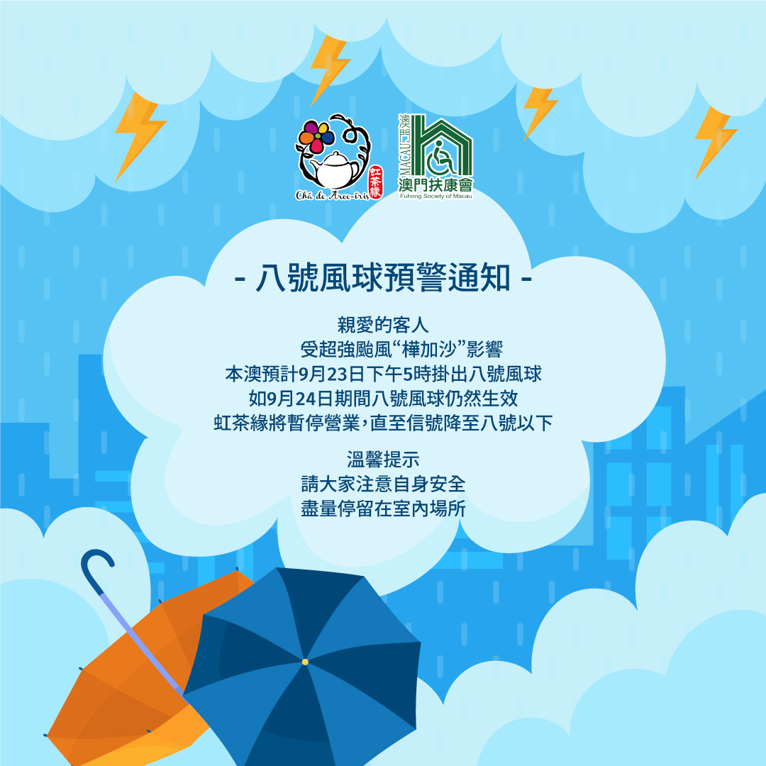 因受超強颱風“樺加沙”影響,本會轄下的虹茶緣及葡角訓練餐廳於本日(9月23日)暫停開放。