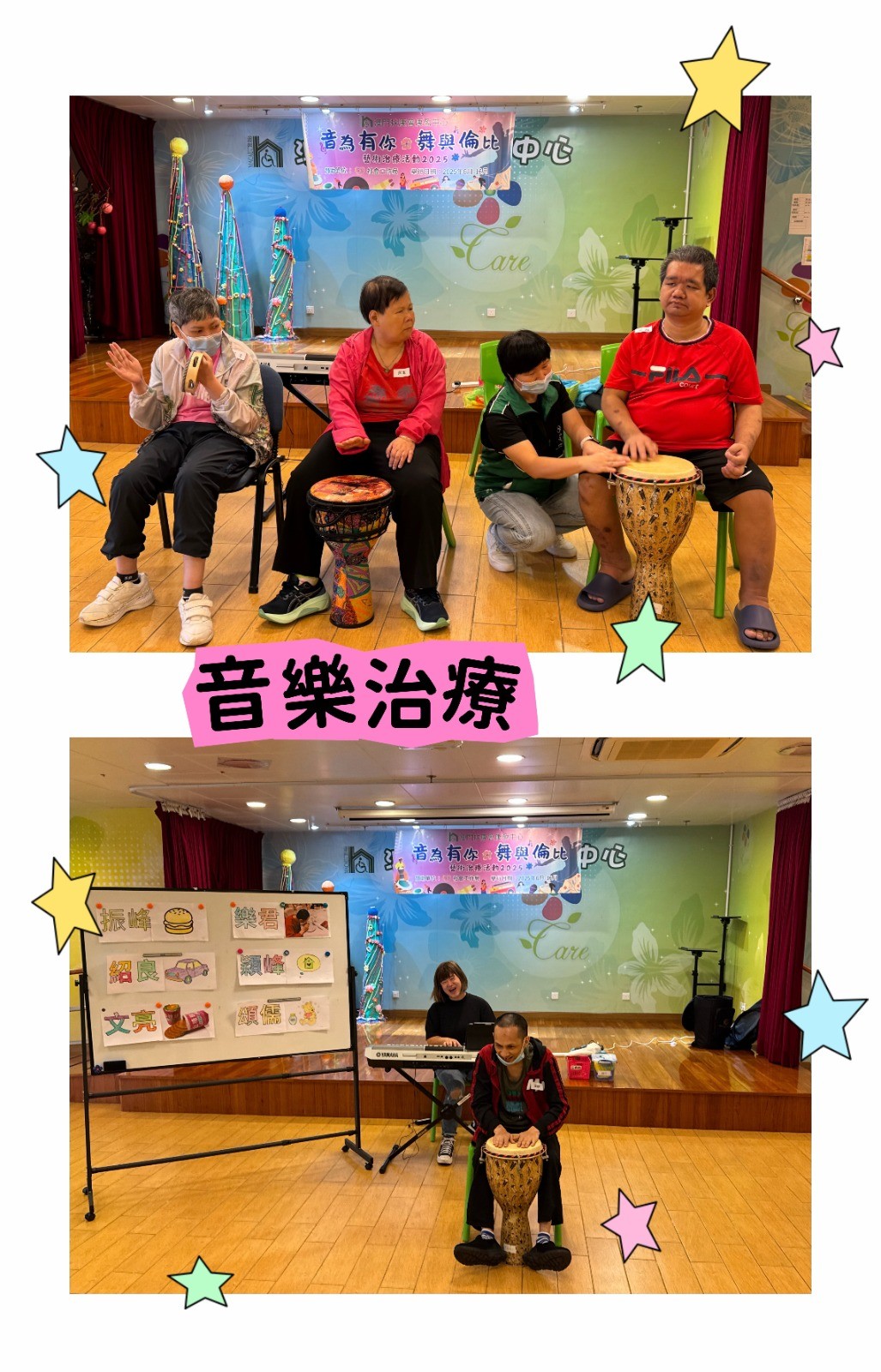 在為期13節的「音樂治療」活動期間,服務使用者在音樂律動、歌曲創作及樂器合奏等活動十分投入,在治療師的引導和協助下,服務使用者成功創作了改編歌詞的「茶樓歌」和「共譜樂曲」,並透過同儕和治療師的正面回饋提升成就感。