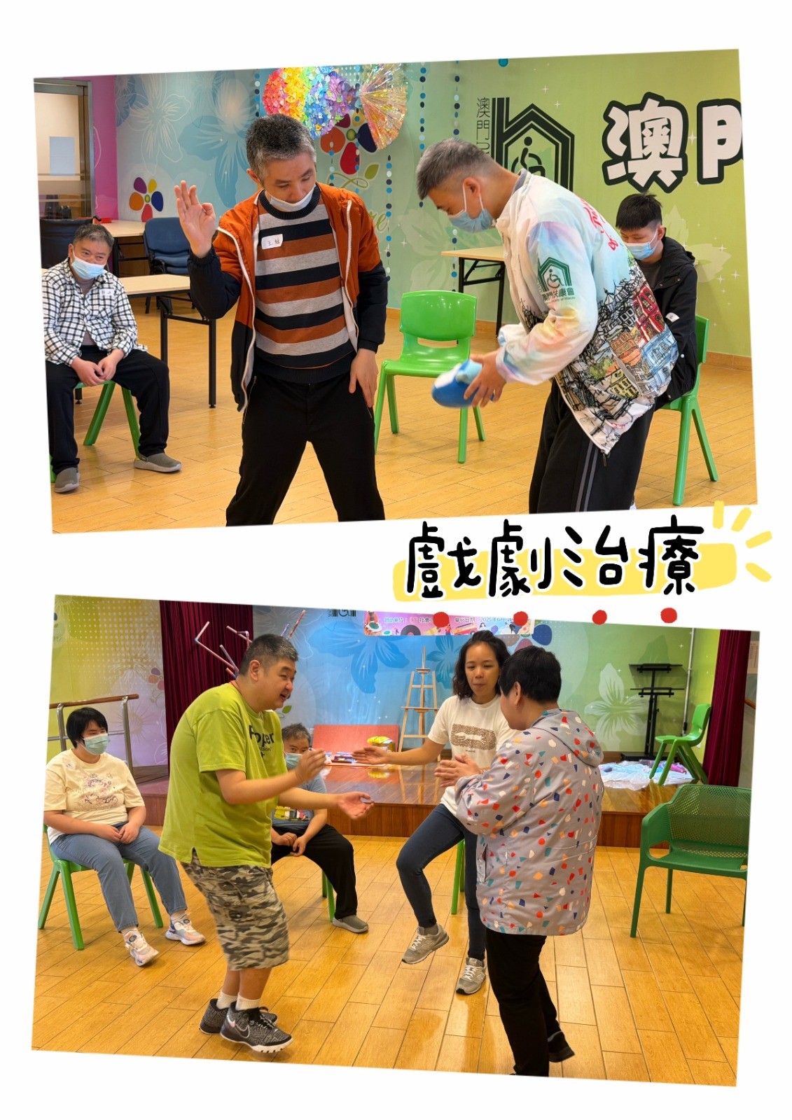 「戲劇治療」以10節的共生舞展開,治療師引導服務使用者進行非語言的身體表達與互動,設計了「絲巾拋接」、「你動我停」以及「配合空間」等活動,旨在讓服務使用者學習觀察與回應同儕的舞動動作,從而提升社交互動表現,整個過程不僅帶來愉悅與自在的體驗,也強化了服務使用者的自我效能感。