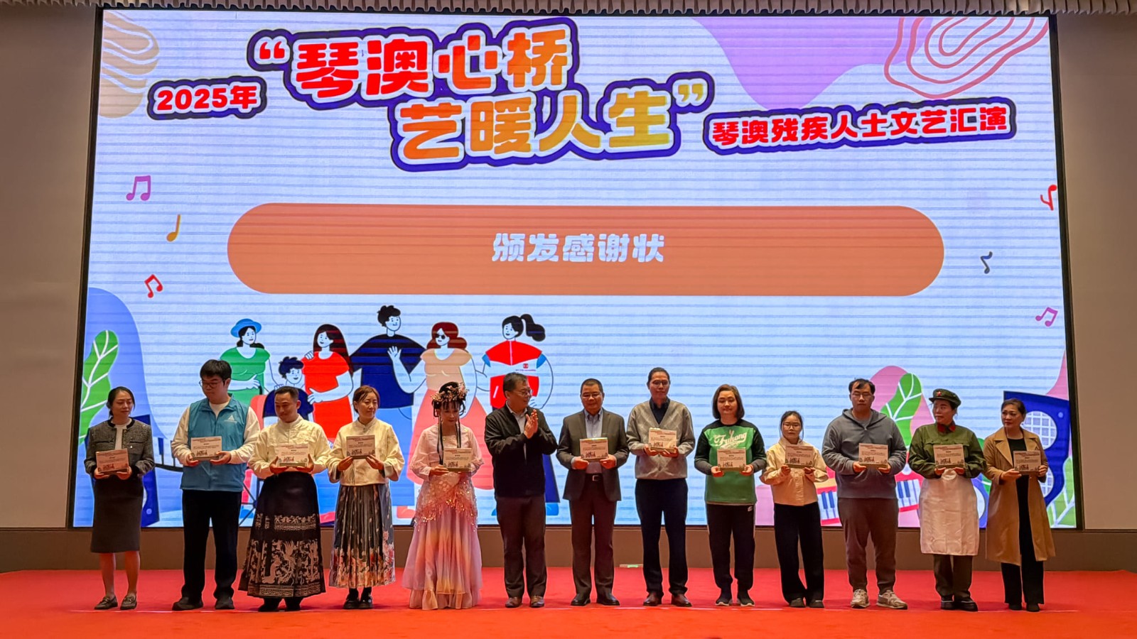 日前(11月29日),本會參與由橫琴粵澳深度合作區工作辦公室社會事務局主辦,澳門工會聯合總會廣東辦事處、合作區社區居民發展中心聯合承辦,蓮花社區協辦的【琴澳殘疾人士文藝匯演"琴澳心橋 藝暖人生"】。活動由本會行政經理卓敏儀女士應邀出席並代表接受紀念狀,同時,本會樂隊LIFE BAND主音劉康亦有幸受邀成為演出者之一,表演原創歌曲「幸福之約」。