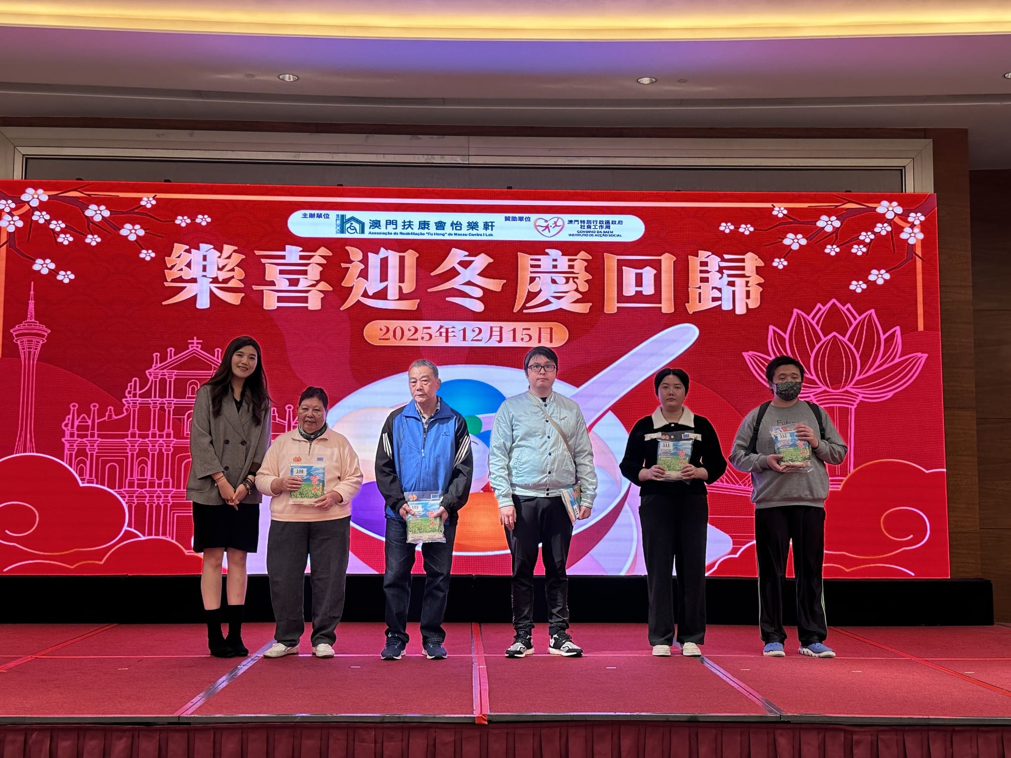 由社會工作局贊助、澳門扶康會怡樂軒主辦的「樂喜迎冬慶回歸」活動於12月15日圓滿舉行,吸引服務使用者及家屬共110人參與,理監事們及各中心經理蒞臨現場,共享冬至團圓與回歸喜悅。