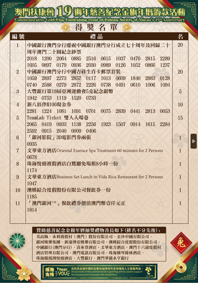 早前本會為答謝各位的支持,舉行了十九週年慈善紀念金旗的幸運抽獎活動,送出了合共超過90份禮物,而一眾幸運兒可憑金旗正本或相片證明即可前往本會寶翠中心領取相關禮物,但鑒於個別禮品有使用時效性,小編在此都呼籲大家盡快去領取,並附上得獎金旗號碼,大家記得核對自己的金旗,如有中獎請盡快前往本會寶翠中心領取啦!最後領獎日期為4月30日,如在領獎日期前未有領取,將被視為放棄領取禮物,大家記得把握時間快點去領取屬於你的幸運禮物啦!
