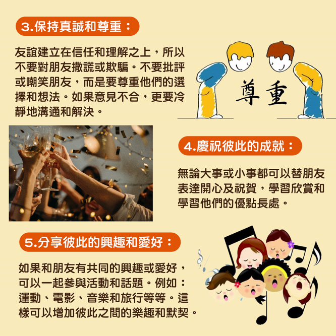 友誼建立在信任和理解之上,所以不要對朋友撒謊或欺騙。不要批評或嘲笑朋友,而是要尊重他們的選擇和想法。如果意見不合,更要冷靜地溝通和解決。