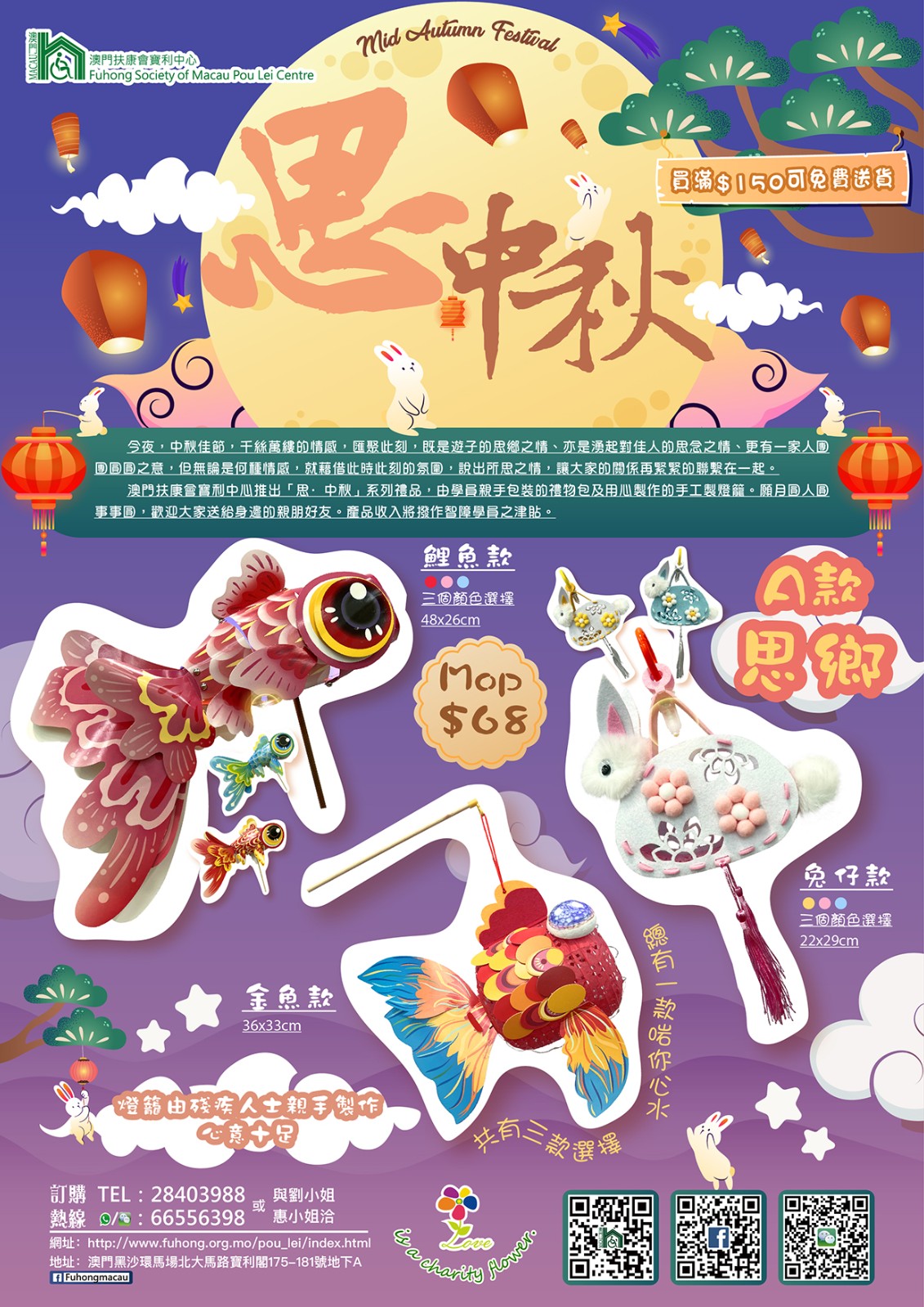 澳門扶康會寶利中心推出「思·中秋」系列禮品,由學員親手包裝的禮物包及用心製作的手工製燈籠。願月圓人圓事事圓,歡迎大家送給身邊的親朋好友。產品收入將撥作智障學員之津貼。