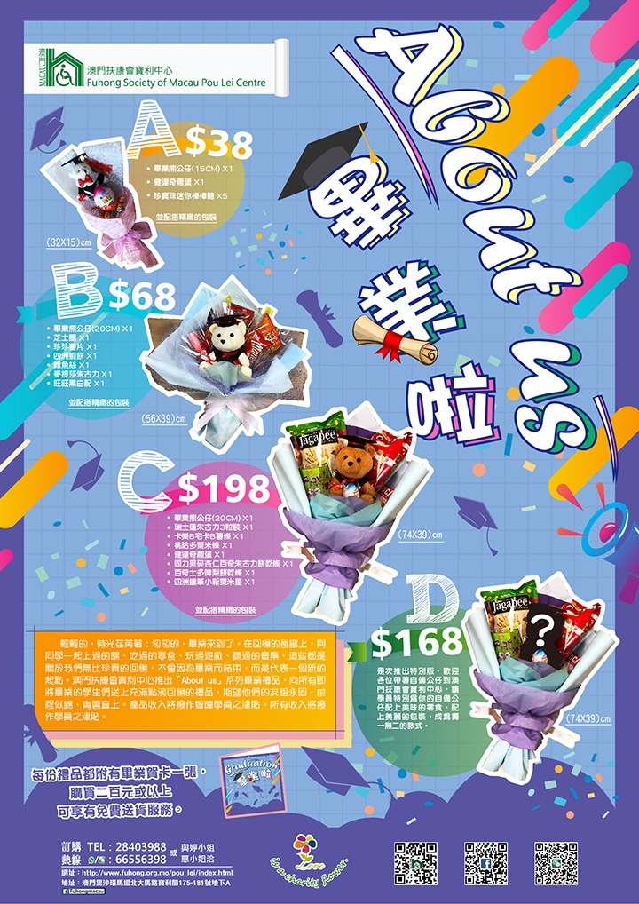 每份禮品都附有畢業賀卡一張,購買二百元或以上可享有免費送貨服務。請支持殘疾人士,希望得到大家踴躍訂購同時介紹給身邊的朋友,本中心會非常感激! 有關禮品的查詢或訂購,可致電2840 3988與婷小姐或惠小姐聯絡,亦可親臨位於澳門黑沙環馬場北大馬路寶利閣175-181號地下A「澳門扶康會寶利中心」數量有限,售完即止,欲購從速。有關產品更多資訊,請瀏覽本中心網頁: http://www.fuhong.org.mo/pou_lei/index/index.html,亦可於wechat/whatsapp 6655 6398中作線上訂購。感謝對殘疾人士工作的支持。